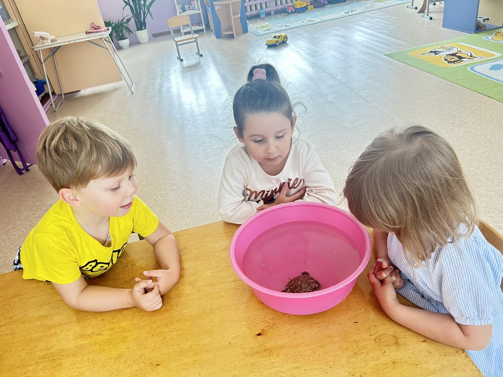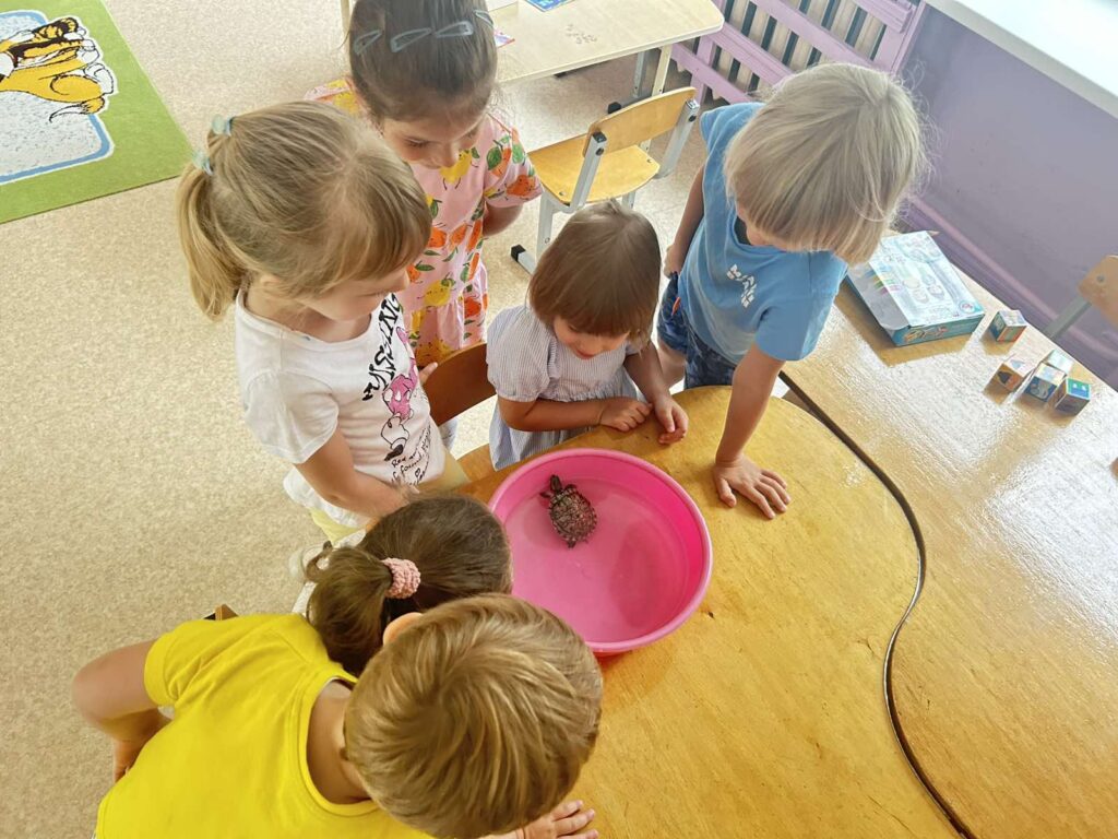 Сегодня наши воспитанники группы «Котята» занимались наблюдением за черепахой. Дети узнали о внешнем виде черепахи, ее панцире, питании и условиях жизни, развивая речь. Обсуждали условия жизни черепахи: тепло, свет, еда (фрукты, овощи). Познакомились со словами, связанными с черепахой: «панцирь», «карапакс», «пластрон».