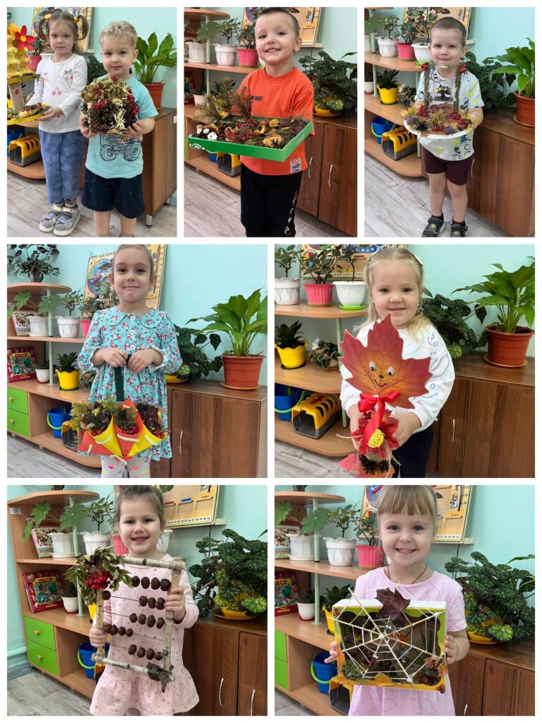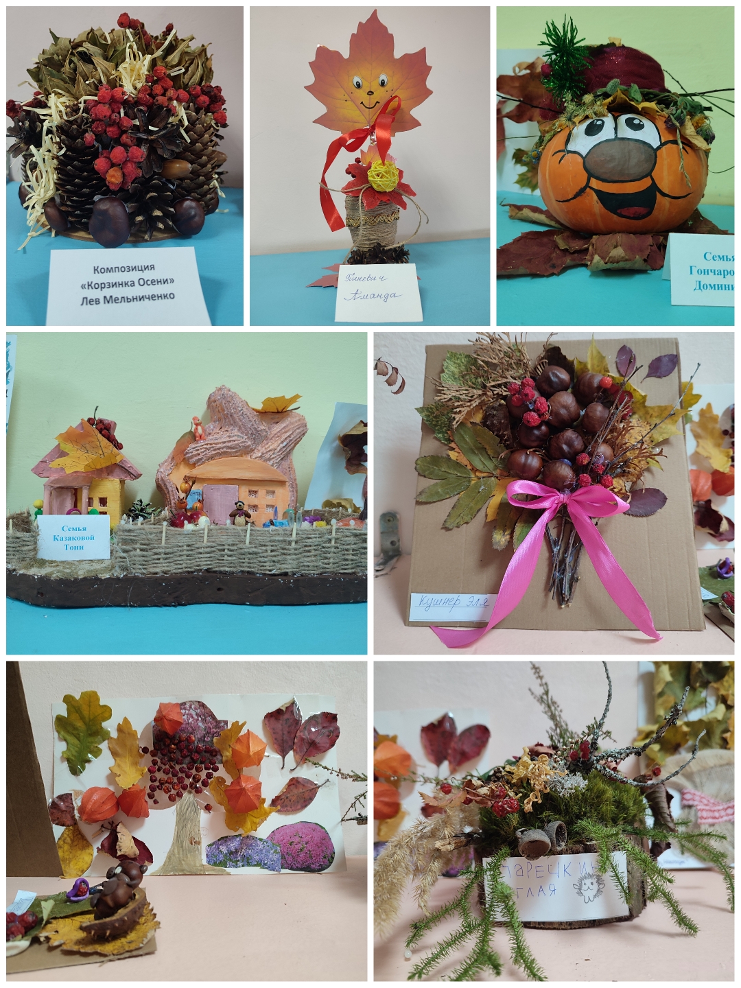 На выставке можно было увидеть: красочные аппликации из природных материалов — листьев, шишек, ягод; живописные работы и поделки в осенних тонах; множество других творческих экспонатов, созданных с любовью и фантазией.