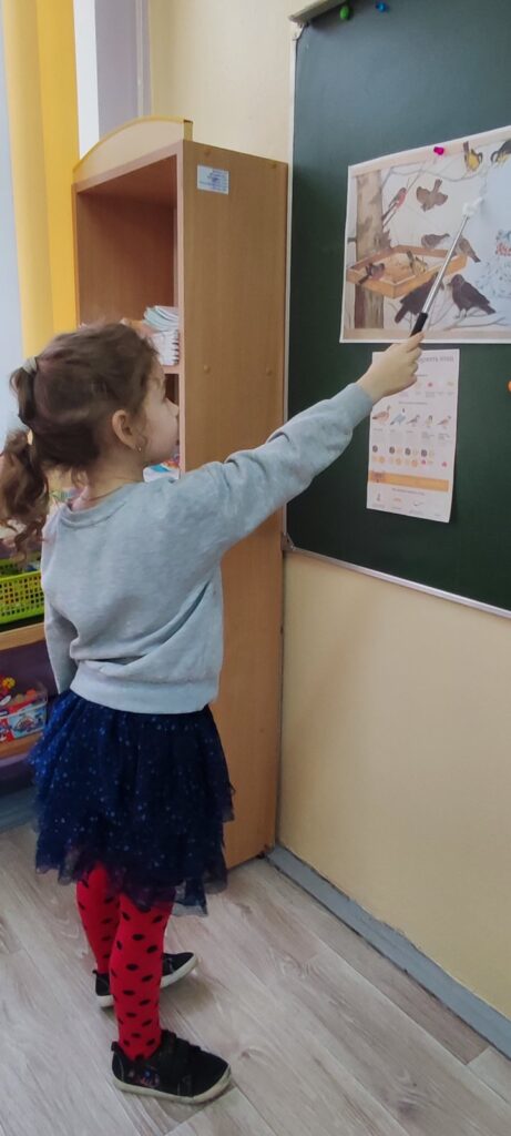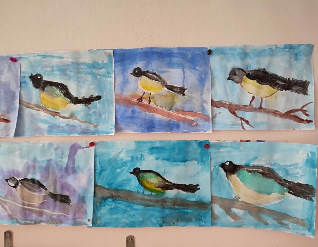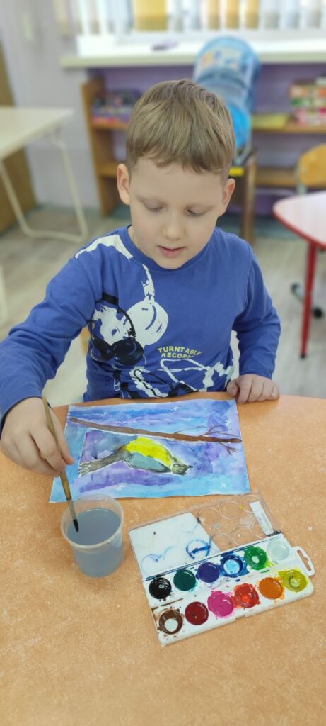 В старшей группе дети узнали, как птицы приспосабливаются к холодам, чем питаются зимой. В рамках темы воспитанники изучали голоса птиц с помощью QR-кода, вспомнили птиц Беларуси, занесённых в Красную книгу. Также попробовали свои силы в смешанной технике рисования – с использованием восковых мелков и акварели. Наши юные художники создали замечательные рисунки на тему «Синичка-невеличка».