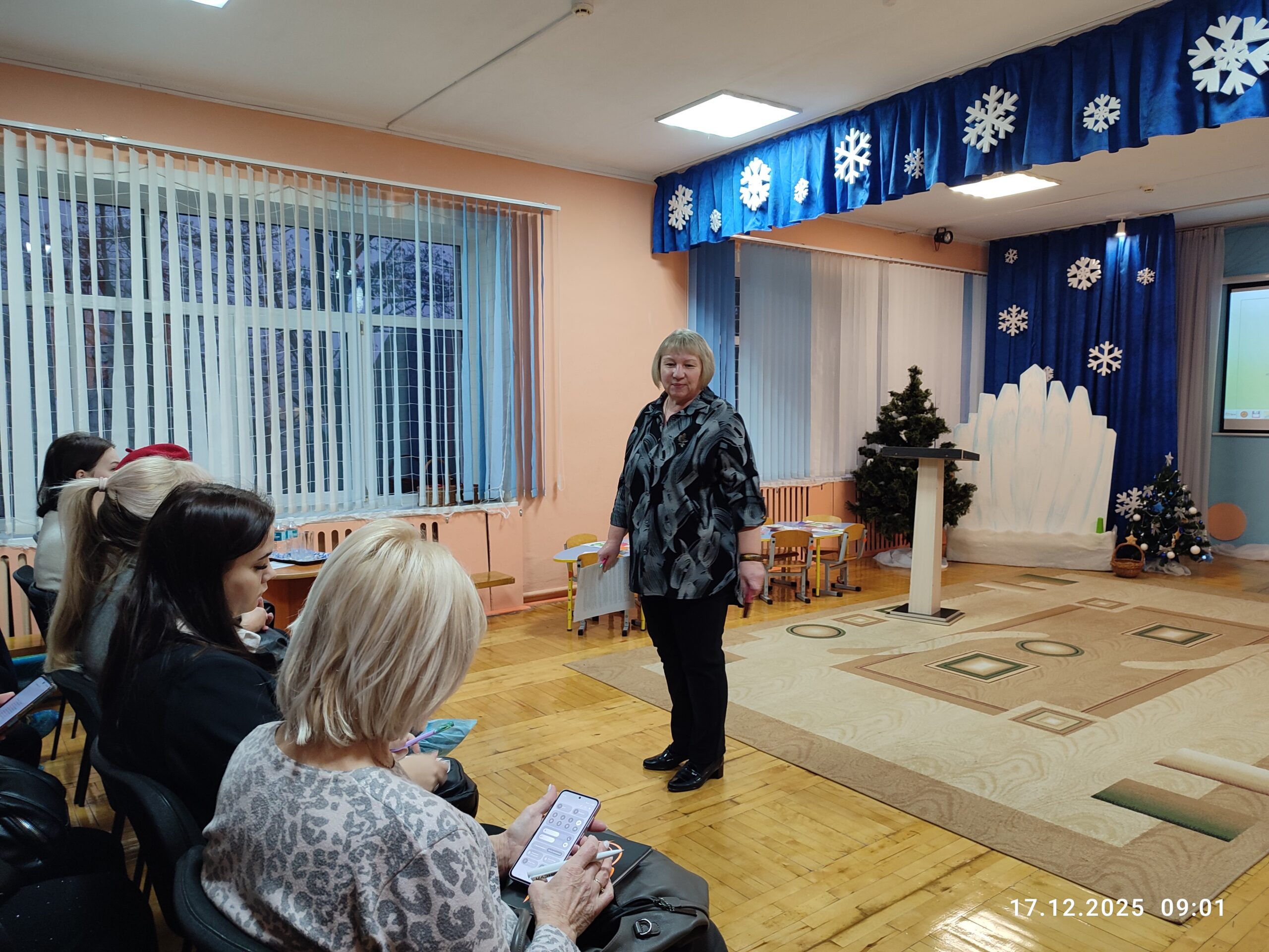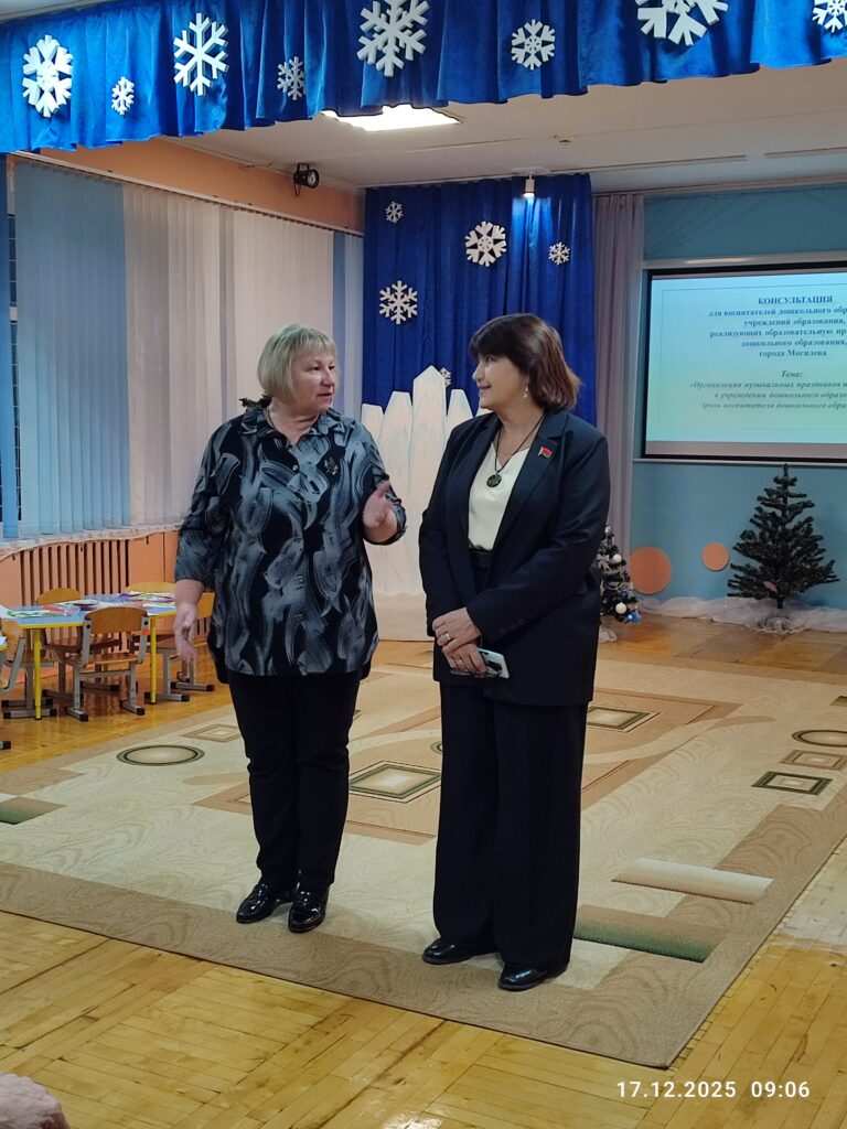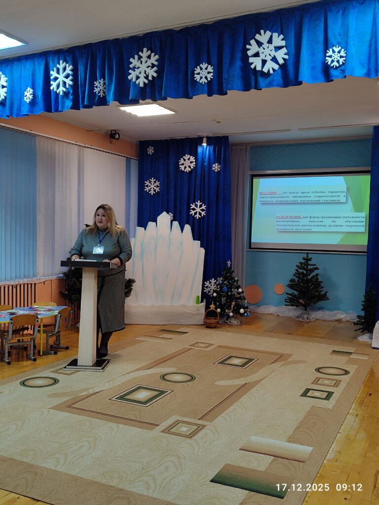 В рамках мероприятия, организованного государственным учреждением по научно-методическому обеспечению учреждений образования города Могилева, которое состоялось 17.12.2025 года на базе нашего учреждения дошкольного образования, специалисты поделились знаниями по темам: Специфика и отличительные особенности проведения досуговых мероприятий (музыкальных праздников и развлечений) в учреждении дошкольного образования, Роль воспитателя дошкольного образования при организации музыкальных праздников и развлечений в учреждении дошкольного образования, Взаимодействие с родителями воспитанников при организации и проведении праздников. Для гостей был организован показ музыкального развлечения «В гости к Снеговику» во второй младшей группе. Такой опыт способствует укреплению педагогического мастерства и развитию творческих навыков воспитателей дошкольного образования.