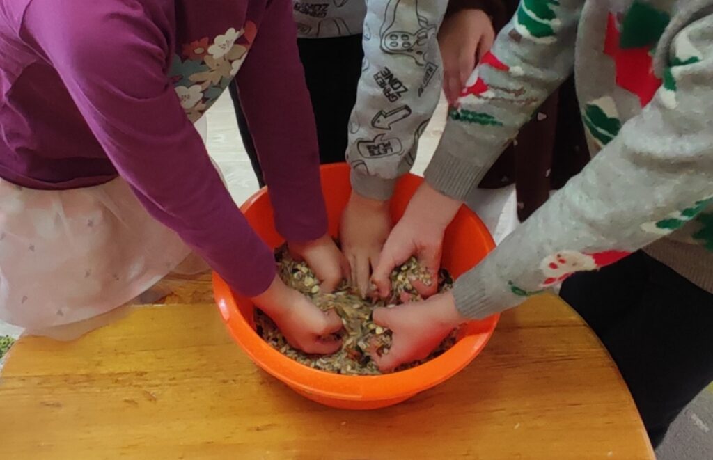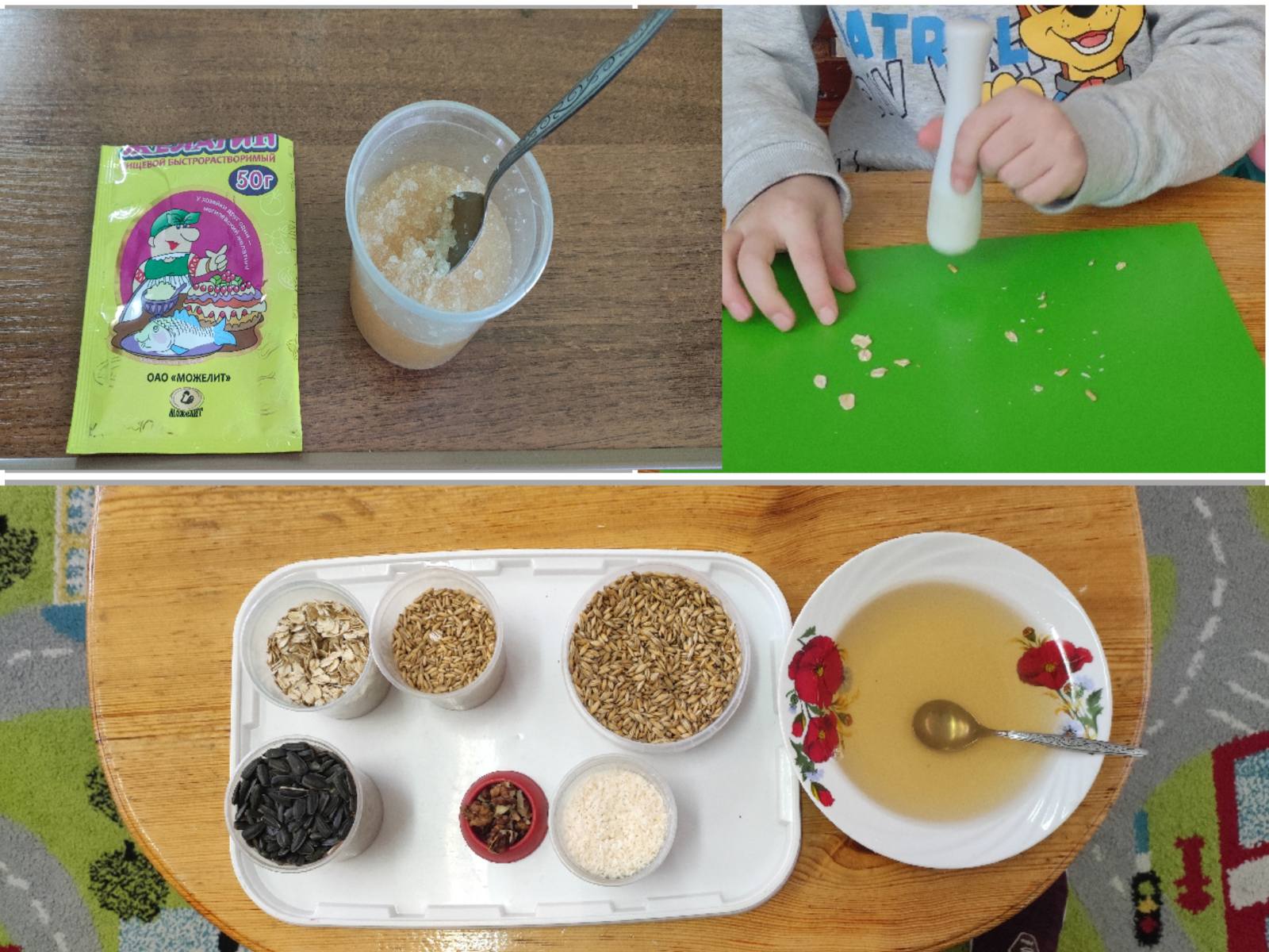 Существует немало вариантов приготовления зимнего угощения для птиц. Ребята старшей группы подобрали необычный вариант приготовления «кормушек» с помощью желатина. В процессе работы дети узнали, что желатин производят на Могилевском предприятии «Можелит», а также были удивлены необычным применением желатина в быту-можно сделать из него мыло! Интересно было узнать, как из овсяной крупы делают хлопья и попробовать сделать их самим. Но самым увлекательным для детей было перемешивание всех ингредиентов — настоящая сенсорная коробка. Уже на прогулке готовую » кормушку» повесили на дерево. Угощайтесь, птички!